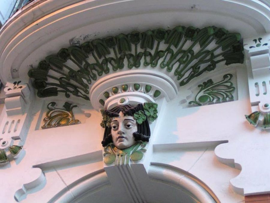 Las balaustradas de este edificio son bajas y reposan sobre cabezas modernistas. El color verde y luminoso de los detalles nos devuelve, estéticamente hablando, a los años más recientes del charlestón.