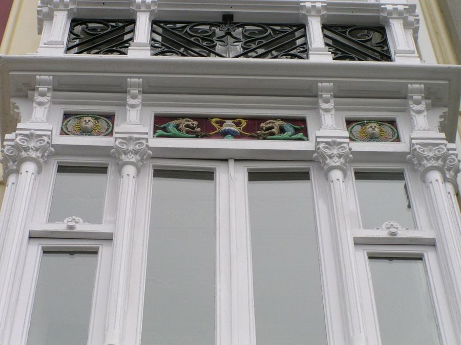 Pero el color se reparte también a veces de manera más artística. Muchos cierres de galería son pequeñas obras de arte. Aunque de estructura blanca, los detalles de los frisos se han pintado de colores y de manera minuciosa.