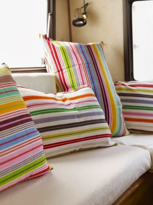 sobre base blanca en el sofá.............¡ los cojines de rayas de colores le dan el toque divertido a la zona de día!