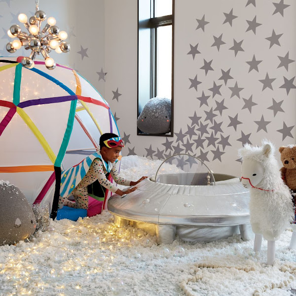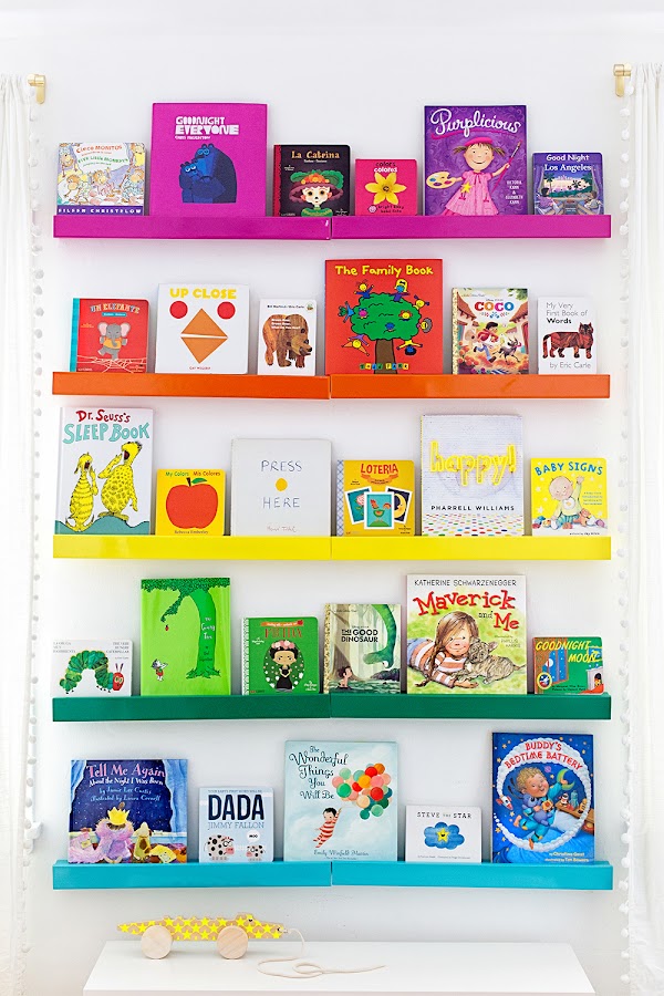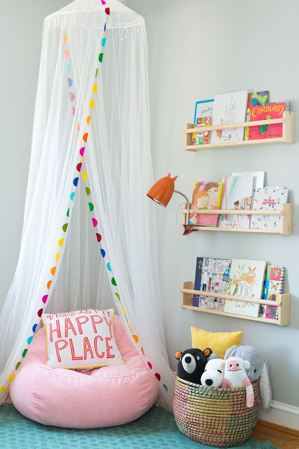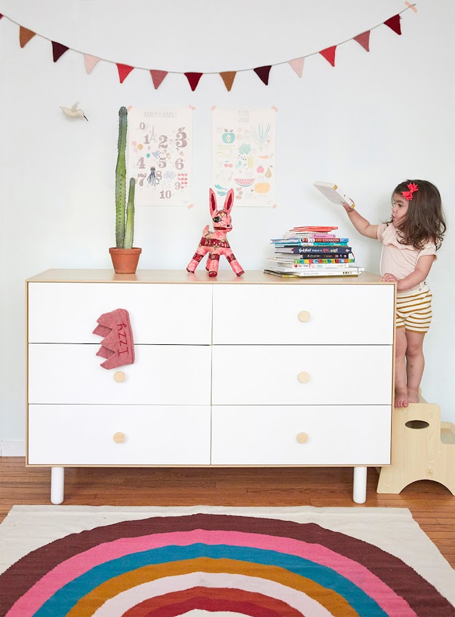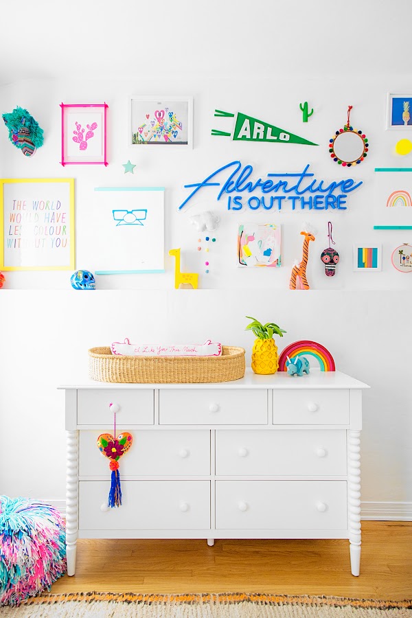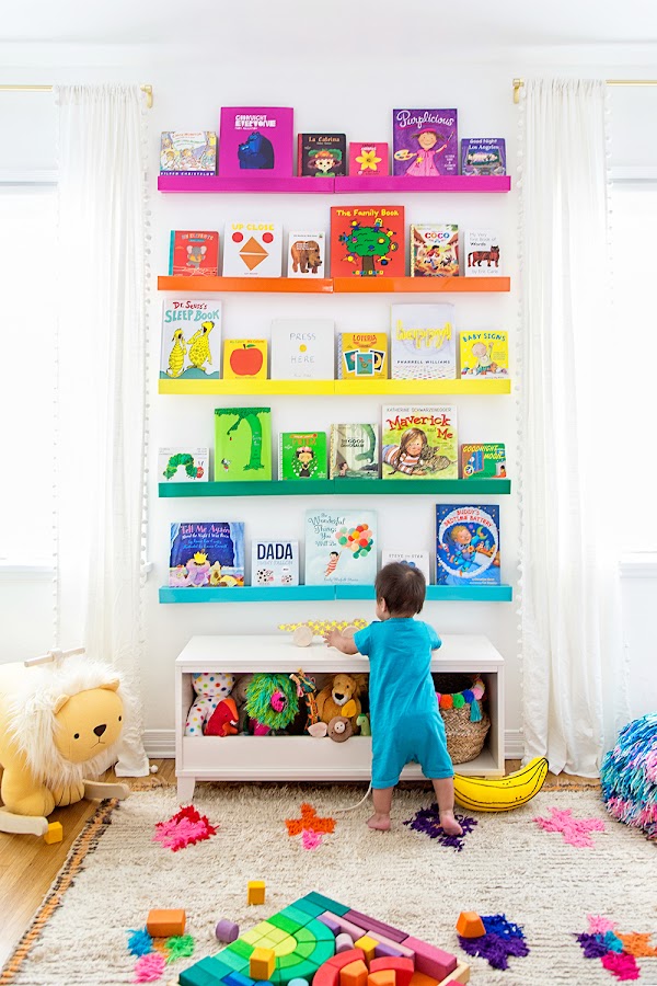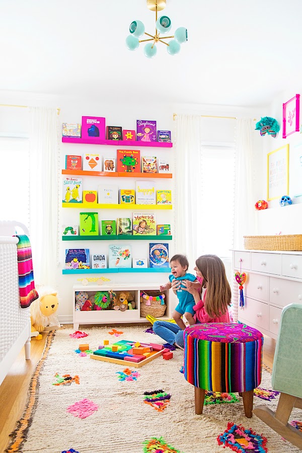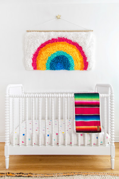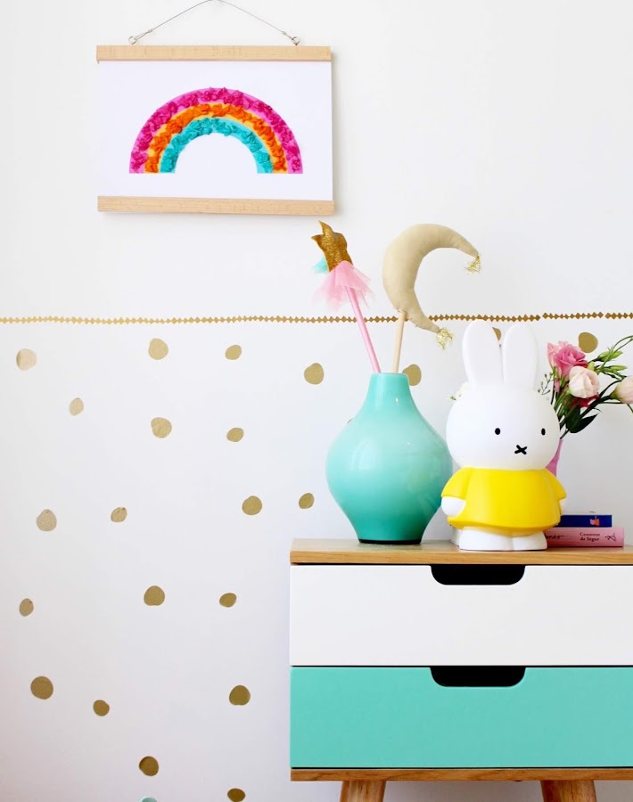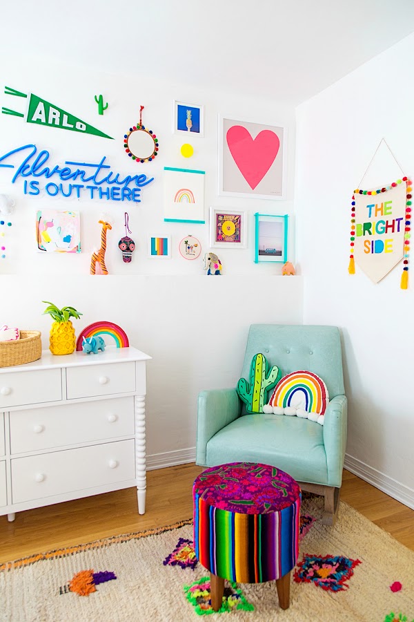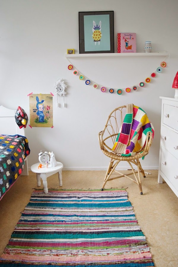 Decorar las paredes con dibujos arcoíris que pueden hacer ellas y ellos mismos, láminas pegadas con cinta decorativa o en marcos, cuadros, tapices que también podéis hacer vosotras mismas con la técnica de bordado de la que os hablamos aquí... ¡Incluso colgar una alfombra en la pared! Las posibilidades son infinitas ;)Vía Lustliving