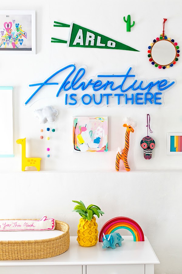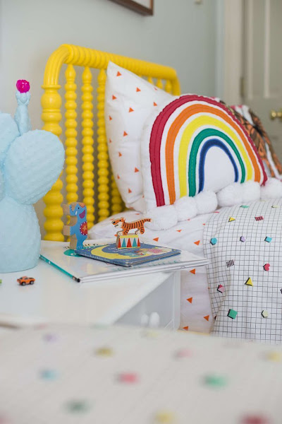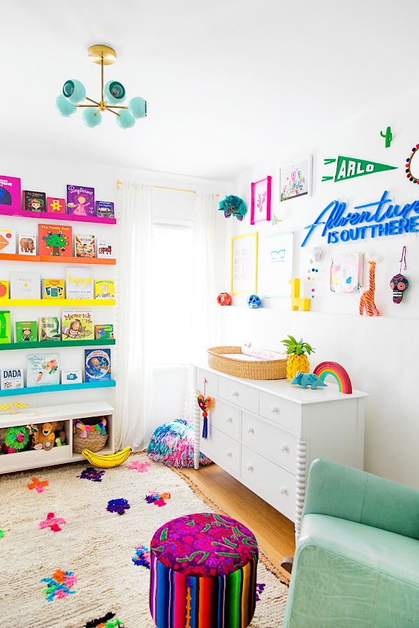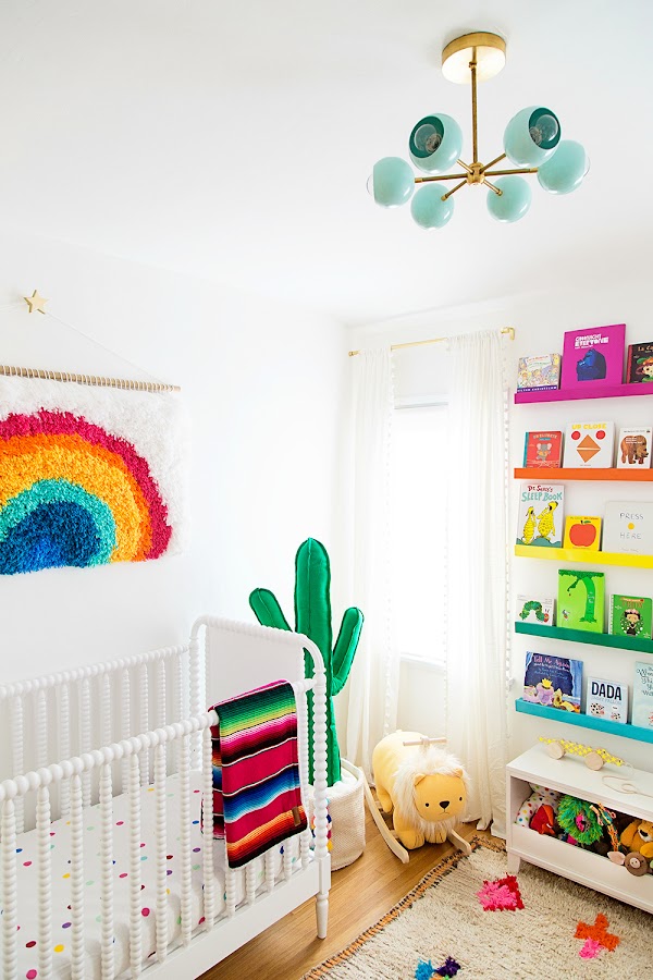 Con todos estos elementos que acabamos de repasar, hemos encontrado en la red un dormitorio infantil que arcoíris mires por donde mires...Se trata del dormitorio de Arlo, el hijo de la blogger Kelly Mindell de Studio DIY, blog que destaca por su buen rollo, alegría, buenos DIY y color ¡El dormitorio de su hijo no podía ser de otra manera!