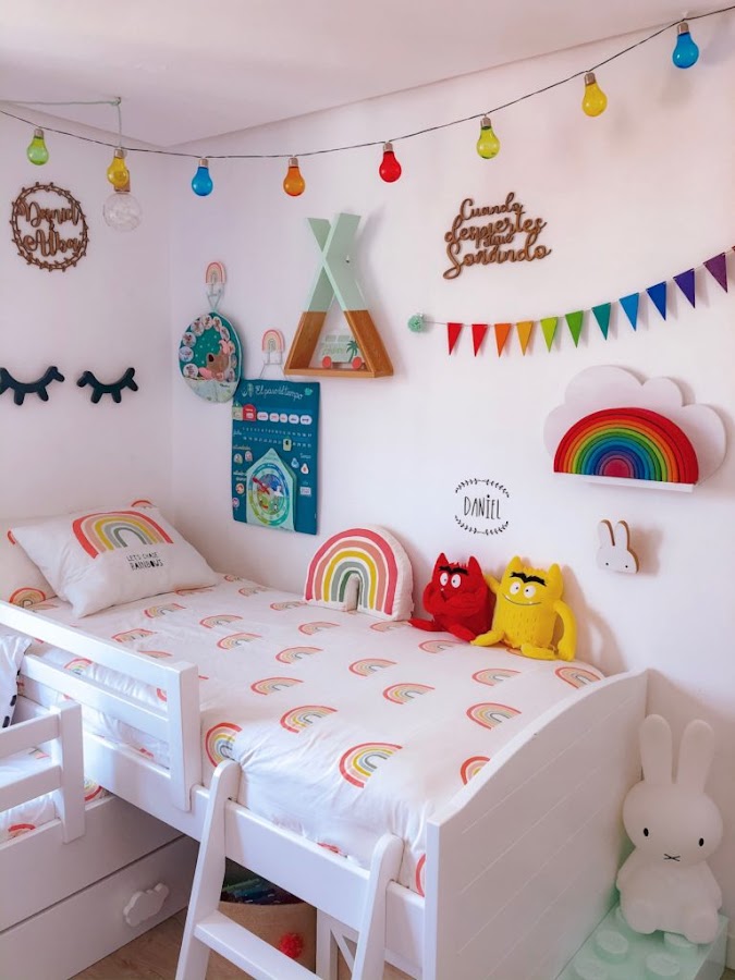 En estos días, esta simbología que representa el arcoíris es más que bienvenida en todas nuestras casas, sobretodo, para los más pequeños y pequeñas que están demostrando ser unos campeones y campeonas, verdad? ¿Decoramos su dormitorio con él?Primero veremos piezas habituales en la decoración de los dormitorios infantiles en las que el arcoíris está presente, en segundo lugar veremos un dormitorio infantil en el que el arcoíris es protagonista absoluto como hilo conductor de toda la estancia; y para acabar, nos iremos de compras en familia ¿Empezamos?