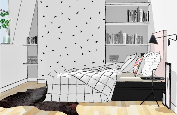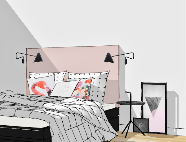 Para la ocasión hemos elegido un proyecto de asesoramiento que estamos terminando para un dormitorio en una casa abuhardillada. El tamaño es bastante ajustado por lo que buscamos aprovechar al máximo el espacio y jugar con la luz utilizando contrastes de color y de forma y limitando el mobiliario al mínimo.