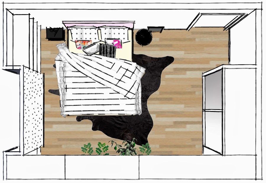 Una alfombra de Ikea de piel y unos adesivos de Ferm living completan el conjunto. Ya veis que todo está marcado por lineas geométricas y color blanco, negro, gris y rosa principalmente.