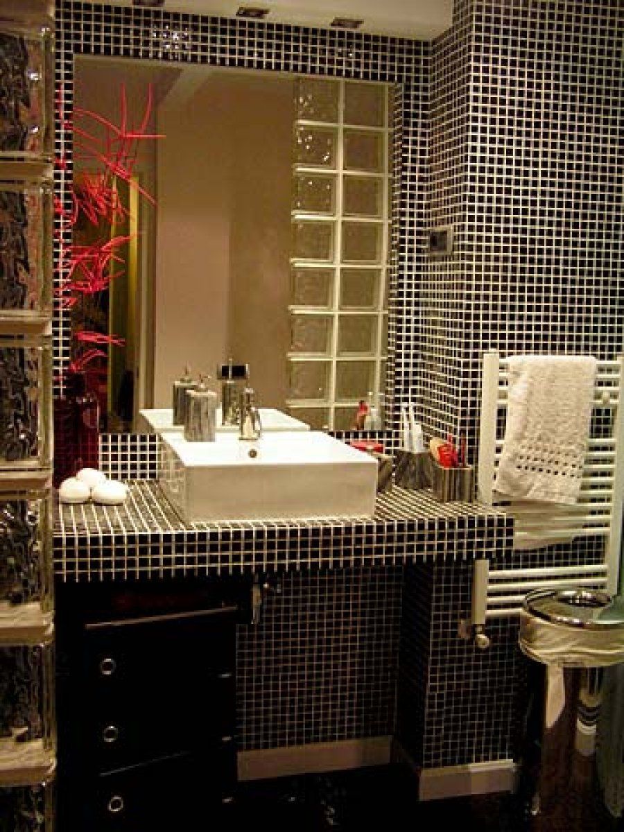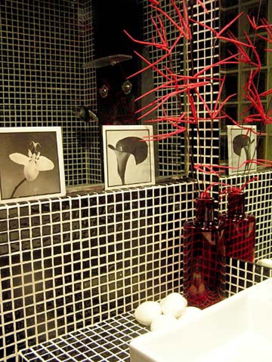 Para el baño se optó por la elegancia del gresite negro y por el efecto de aislamiento de los muros de cristal pavés. Se ha jugado con objetos decorativos en blanco (piedras), rojo (jarrón y flores secas) y piedra veteada (recipientes y dispensador), así como con postales en blanco y negro.