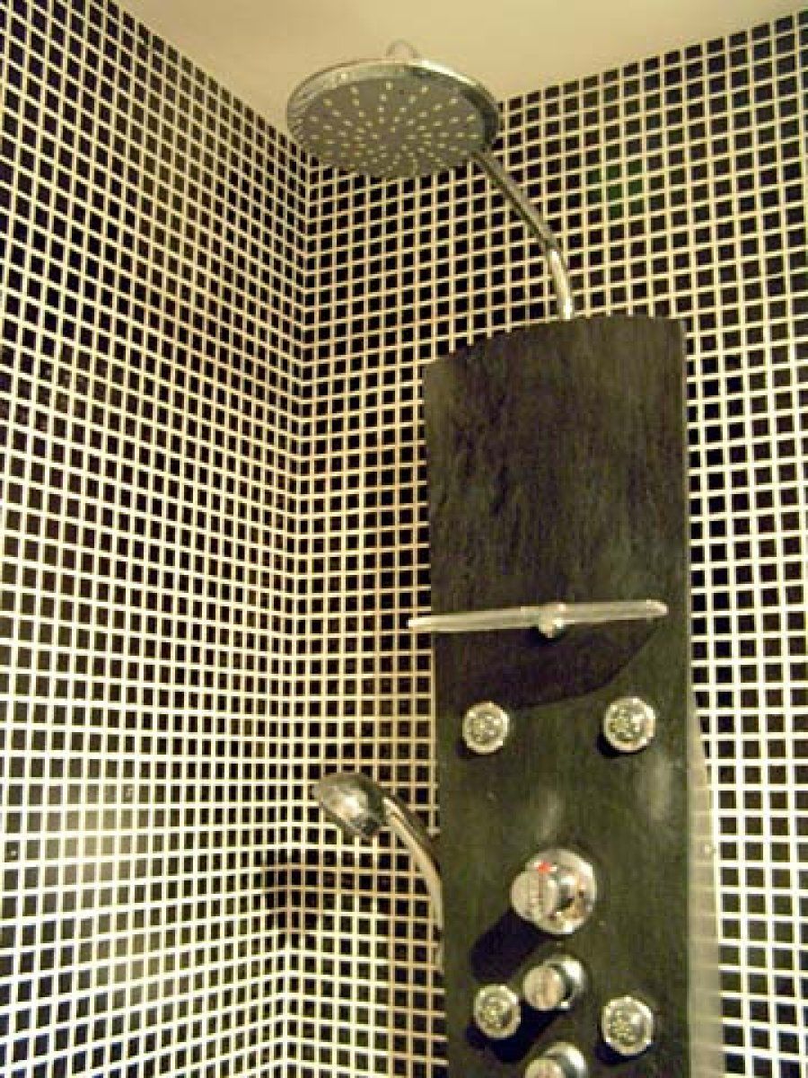 Asimismo, se han disimulado los accesos a otras instalaciones de uso higiénico diario con puertas traslúcidas. La columna de ducha está revestida de pizarra mientras que inodoro y bidé continúan siendo fieles a la porcelana blanca, igual que el lavabo de planta cuadrada provisto de grifo monomando.
