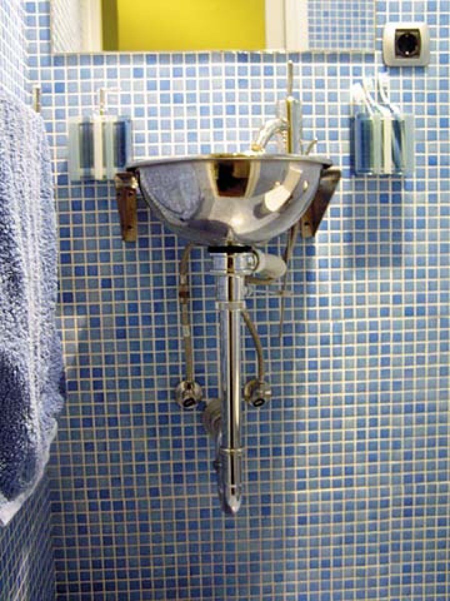 La habitación de invitados aún no está lista, pero hemos querido mostrar el delicado trabajo que se ha realizado en el aseo auxiliar, cuya superficie ha sido literalmente robada a este dormitorio. El gresite azul inunda este mínimo baño al que se ha dotado de una pila en acabado plateado y algunos cuadros temáticos.