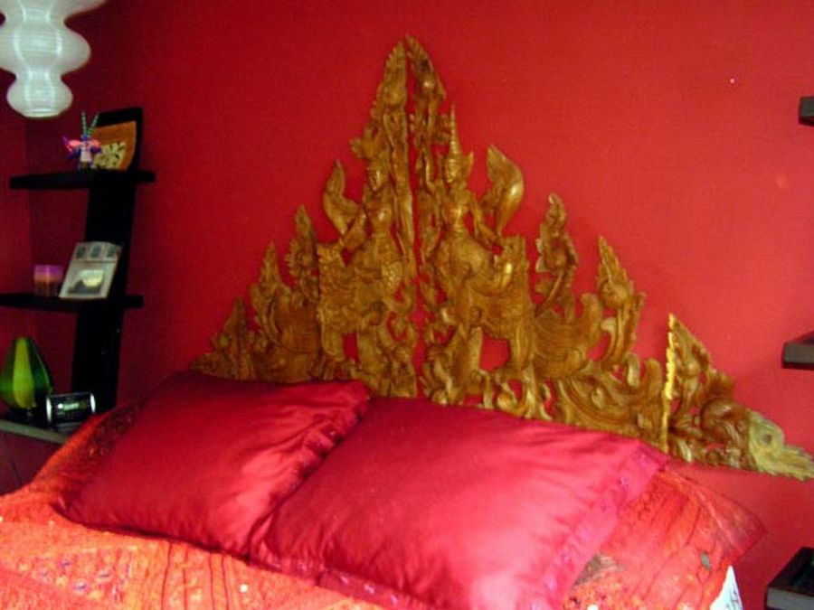 Las ferias actuales inciden en los textiles con bordados geométricos con hilos dorados y espejos. La colcha de la cama tiene este esquema y la trajeron de las Islas Mauricio, mientras que hoy muchas tiendas españolas distribuyen modelos similares. El cabecero es una auténtica joya: una composición en bajo relieve de corte oriental.