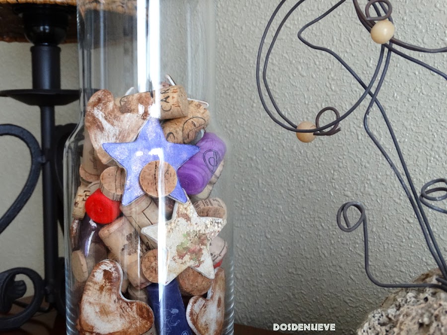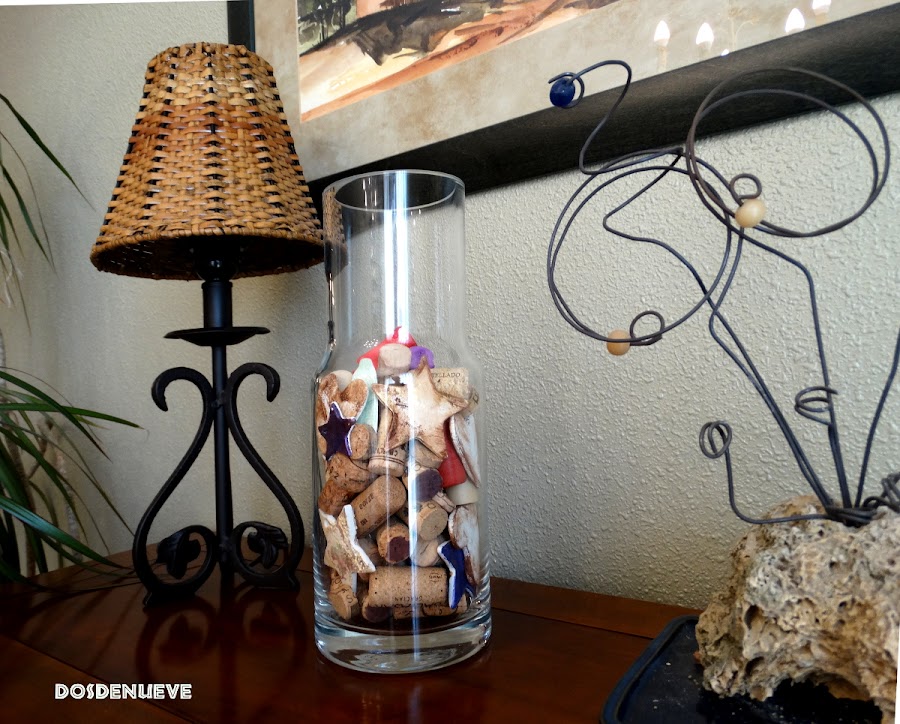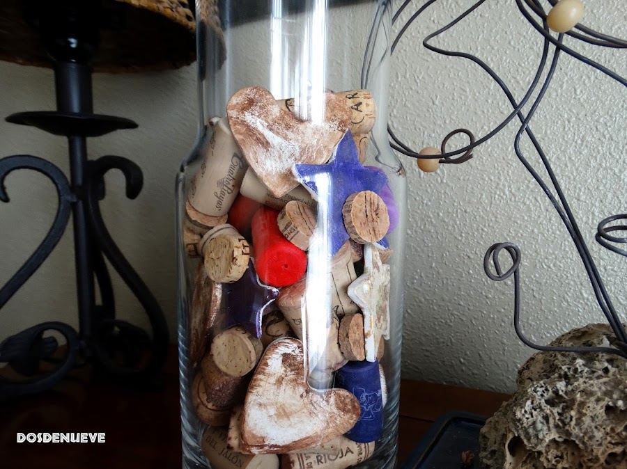 Detalle del jarrón decorado con corchos de botellas de vino