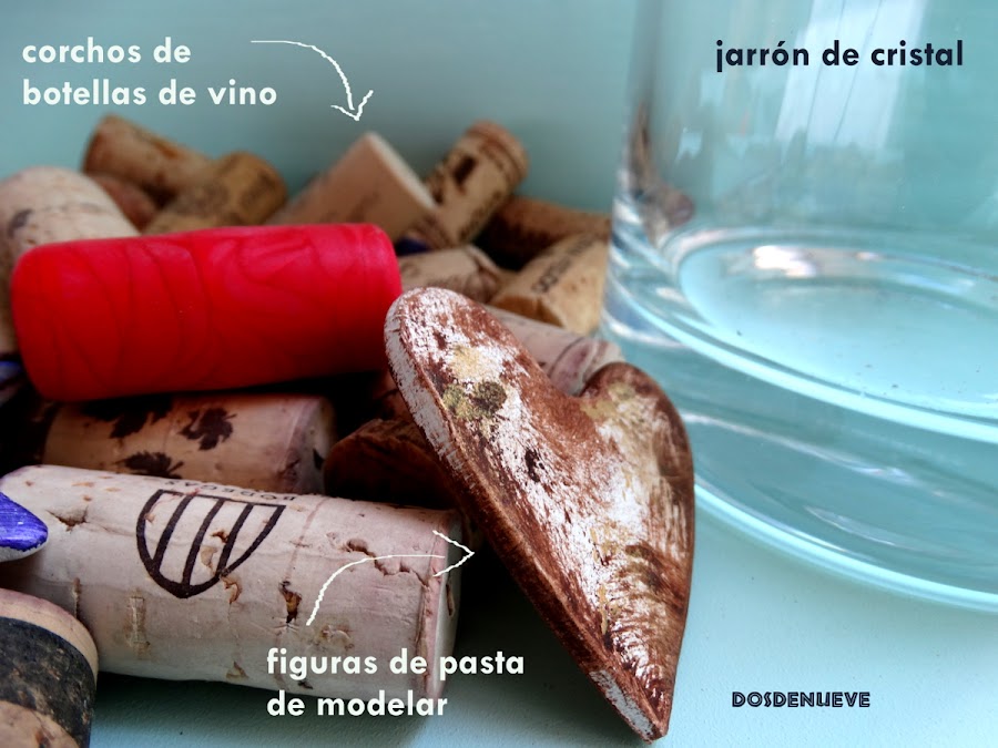 La materia prima es sencillísima, corchos de botellas de vino que hemos abierto en diferentes veladas...