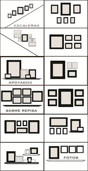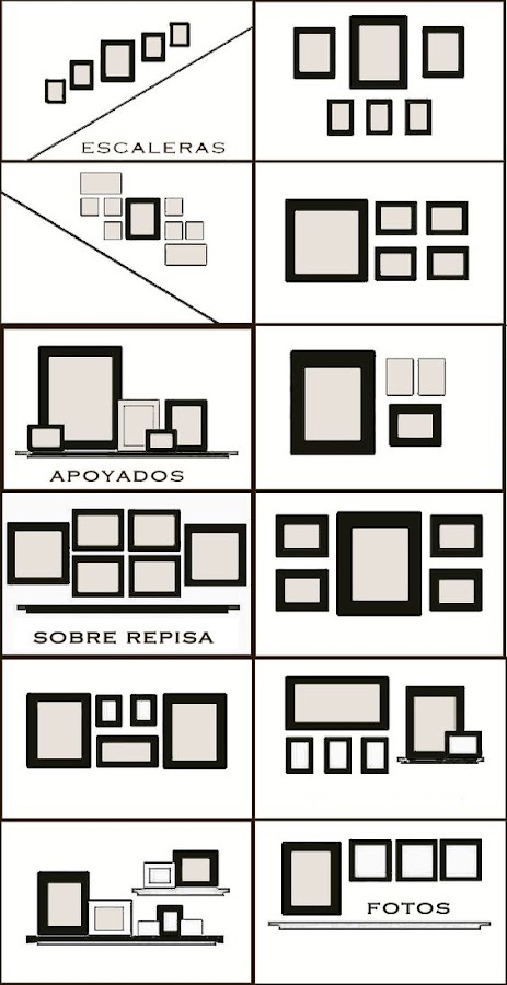 Cuando llegamos a nuestro nuevo apartamento o simplemente cuando despertamos un día con las ganas infinitas de realizar algunos cambios siempre se nos ocurre exponer algo en la pared, ya sean fotos, dibujos o alguna pintura. En ese caso, las composiciones son las mejores aliadas. Por ejemplo, si queremos mostrar fotografías debemos elegir las mejores, las que nos traen hermosos recuerdos y las que cuentan una historia. Lo ideal es mandar a hacer los marcos todos del mismo color y textura, la forma puede variar siempre y cuando pueda encajar perfectamente en nuestra composición. Cuando hablo de composición me refiero muchos cuadros formando una gran figura (conjunto de cuadros) ya sea un cuadrado, rectángulo, ovalo o tal vez otras figuras geométricas.