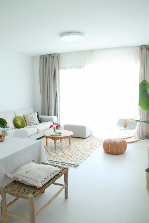 Tras la reforma que hicimos en casa el año pasado, en la que nos decantamos por suelo blanco de microcemento en toda la vivienda, comenzamos poco a poco a cambiar la decoración de nuestro salón y a introducir algunas pinceladas de color con mobiliario y decoración marroquí. Sustituimos una estantería de roble vista en la que almacenábamos revistas y libros por un mueble mostaza, (que nos hizo a medida un pequeño artesano en Marrakech) y que hace la función de alacena. Nos gusta mucho porque ahora el comedor está mucho más ordenado y visualmente es más agradable. Encima del mueble solemos ir cambiando la decoración, ahora mismo tenemos un par de farolillos marroquíes, que podéis encontrar en la Shop. Nos sumamos a los muebles auxiliares de madera y fibras sintéticas, que quedan bien todo el año y además combinan a la perfección con textiles naturales como el lino y el algodón. Os dejamos unas fotografías de los cambios y os animamos a darnos sugerencias.