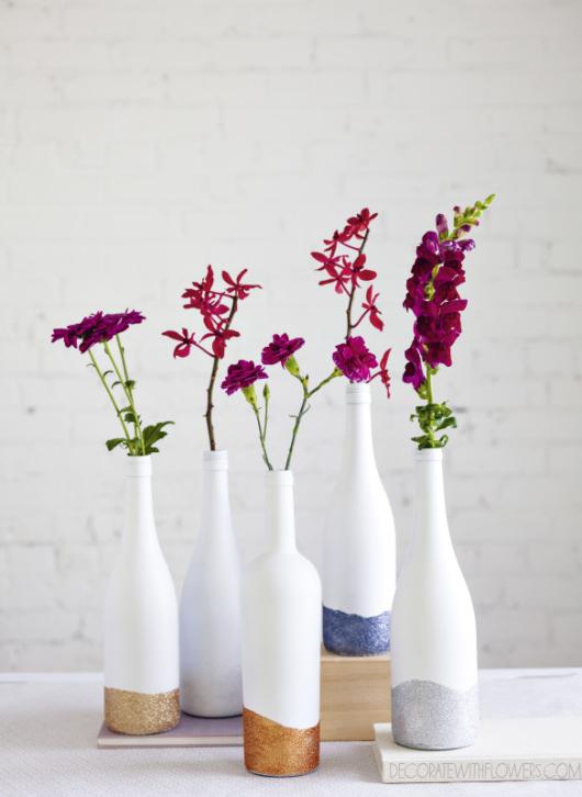 Customiza unas botellas, cuantas tiramos a la basura en todo el año?? muchas...fíjate en este DIY, han pintado las botellas de blanco y le han dado un toque de distinción con un poco de purpurina, te gusta??