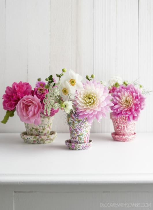 Y estas macetas forradas de tela?? un DIY también muy sencillo de hacer, unas macetas de barro una tela bien bonita y el resultado es muy bueno, no te parece??