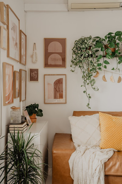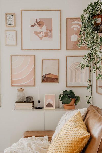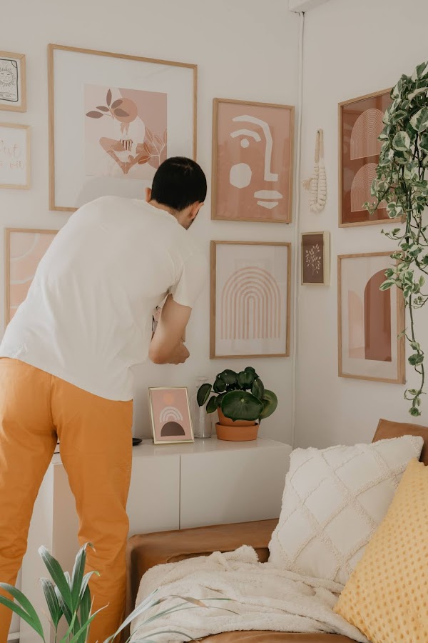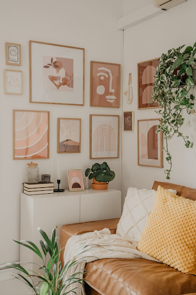 Como ya os he dicho muchas veces, los colores tierra nos encantan y esos fueron los que elegimos para recrear una pequeña gallery wall en la zona del sofá. Como veis, hemos cambiado el sofá por otro más pequeño y así hemos ganado espacio en la zona del salón. Lo siguiente fue recrear en el suelo la distribución que queríamos y una vez listo pasarlo a la pared.