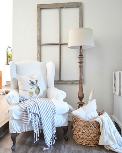 Un sillón orejero algo clásico viste un montón en cualquier rincón, pero hay que saber acompañarlo. Esta idea del gran marco de madera detrás, la lámpara de pie, y una cesta de fibra para dejar una manta y algunos cojines, puede quedar genial en dormitorios, salones o despachos.
