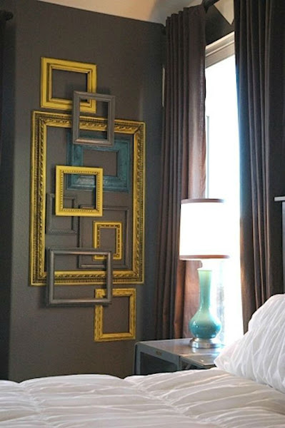 Tan fácil como pintar en un color oscuro, y hacer una composición de marcos encima en tonos intensos. En esta ocasión han pintado la pared en color chocolate sobre la que han colgado como una docena de marcos en azul, gris y amarillo. ¡Elegante y súper efectivo!
