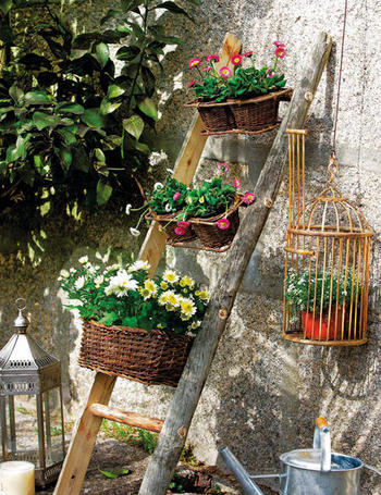 Sólo tienes que apoyarla en la pared y colocar macetas en sus peldaños. Aquí hemos puesto bellis en cestas dobles; cinerarias en la cesta grande, abajo