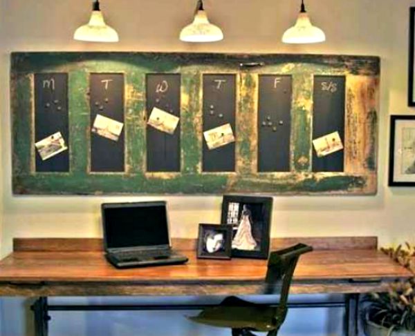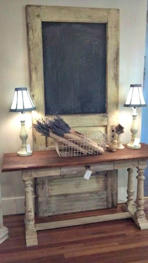 Decoración de entrada con puerta antigua pintada con pintura de tiza