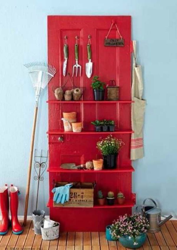 Puerta con estanterías, perfecta para guardar los utensilios de jardinería