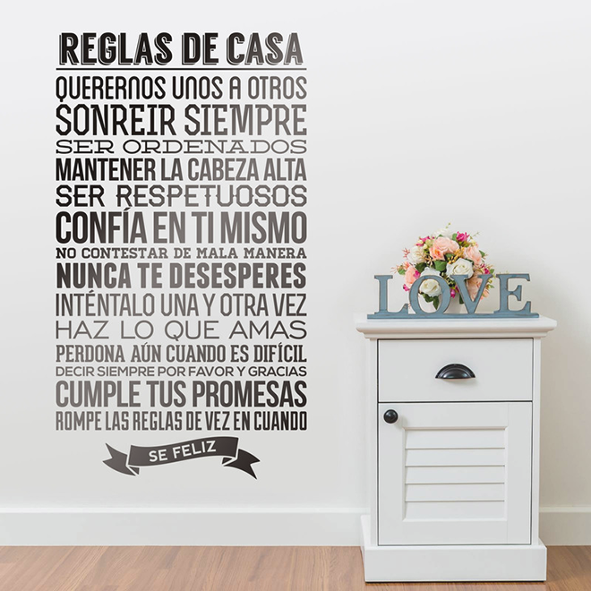 Desde hace tiempo me he vuelto bastante fan de los vinilos decorativos por la comodidad decorativa que tiene. Decoras un espacio sin ninguna complicación y por la facilidad que nos da de sustituir y cambiar cuando nos cansamos de él. De esta manera, teniendo en cuenta que son elementos que no suelen rascarnos mucho los bolsillos, nos permite el cambio para las que nos aburrimos con facilidad de los “decorados” ;-) Esta marca, TELEADHESIVO,se puso en contacto conmigo para darme a conocer sus vinilos y reconozco que los de las frases celebres me gustaron mucho. Así que han decidido que sortearán entre l@s seguidores del blog un vinilo de Frases célebres. Personalmente son los que más me gustan.