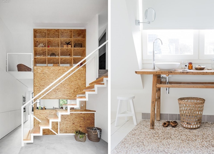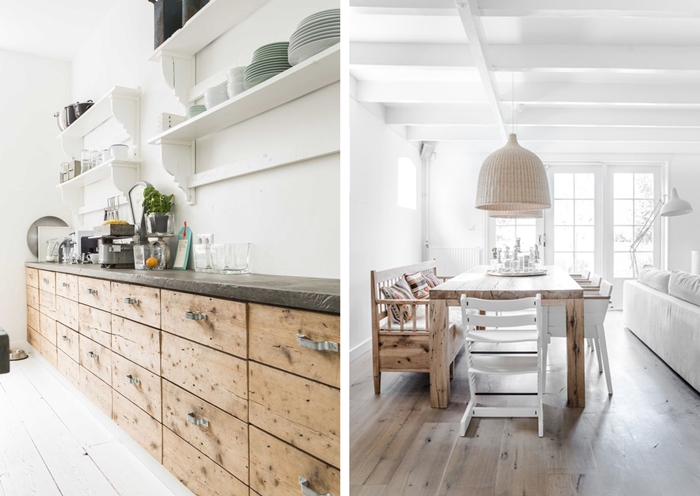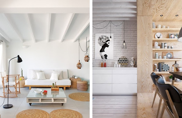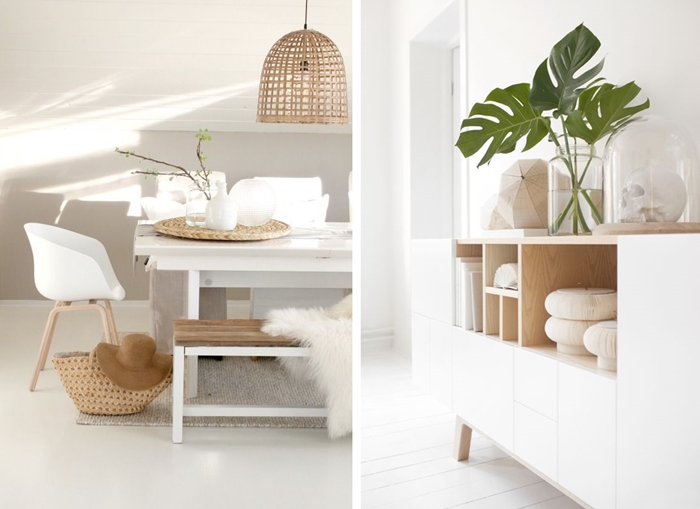 Si hay una decoración que nos esté dando fuerte en casa sin duda es la combinación de blanco y de madera. Nos parece perfecta y además muy tranquila. Aporta mucha calma y relax y eso la verdad es que nos viene genial. Para el suelo, todavía no tenemos muy claro si pintarlo de blanco o dejarlo en tono natural, lo que pasa es que si lo dejamos sin pintar nos gustaría ponerle un barniz mate o satinado, de esos que no cambian el color de la madera.