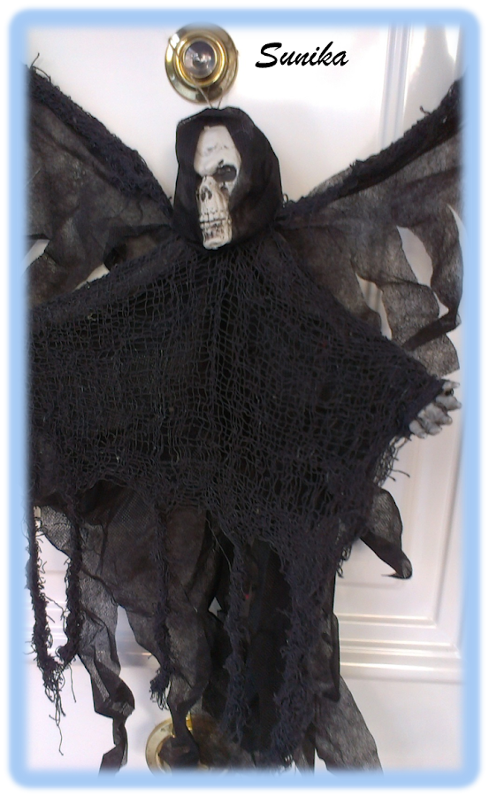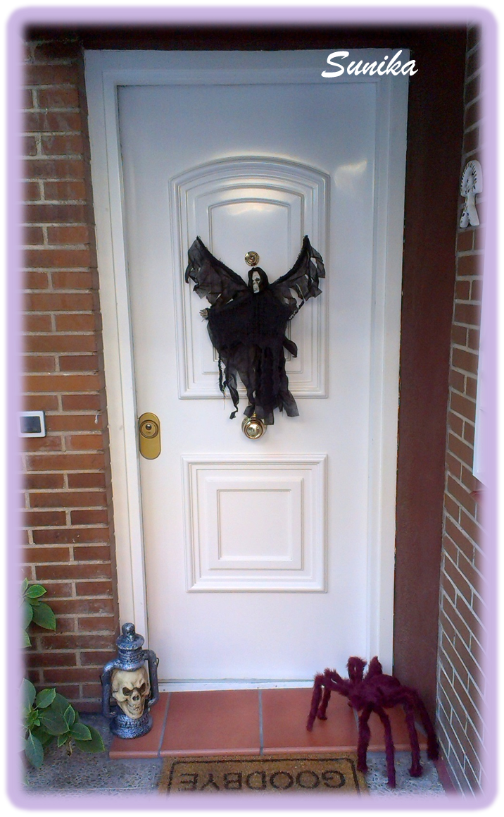 Empezamos con la entrada a la casa, jeje, a ver quien es el valiente que se atreve a llamar para pedir chuches!!! Para esto simplemente hemos usado una araña gigante peluda, una lampara calavera (por la noche encendida los ojos se iluminan de colores y queda genial) y un angel de la muerte colgado en la puerta.