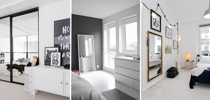 Añade espejos: Otro gran objeto que te va a venir genial para decorar tu habitación es añadirle un espejo. Los espejos agrandan el espacio y aportan muchísima luminosidad. Si puedes, colócalos en la pared donde refleja el sol, y otra muy buena opción es colocar los frentes de los armarios de espejo, pasarán desapercibidos.