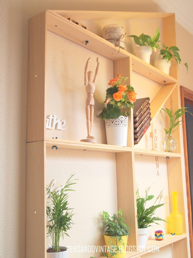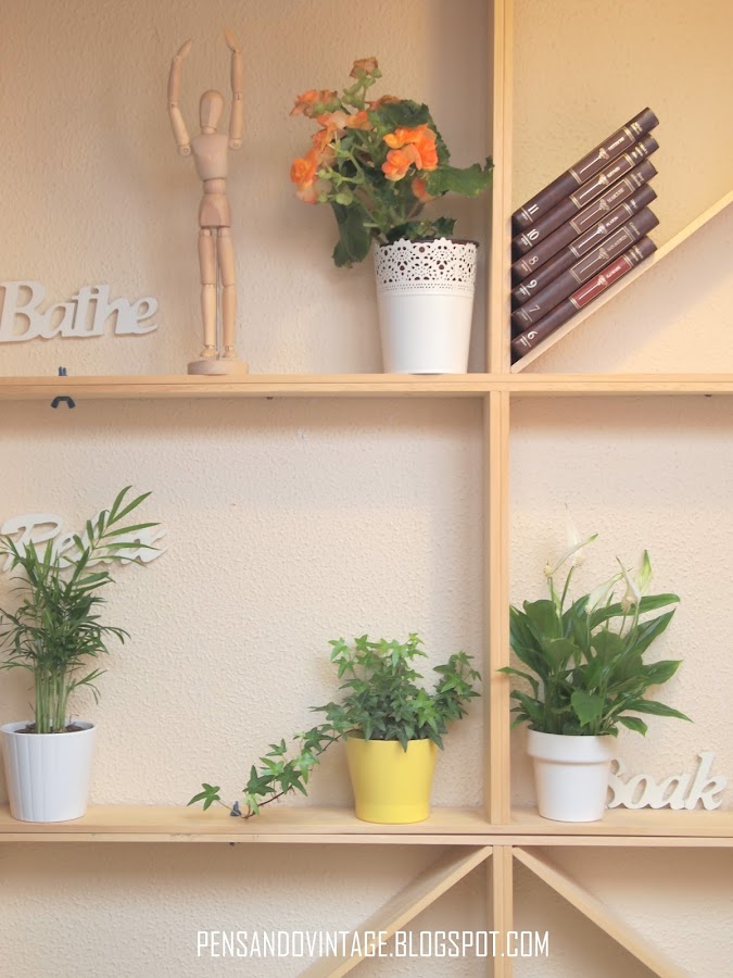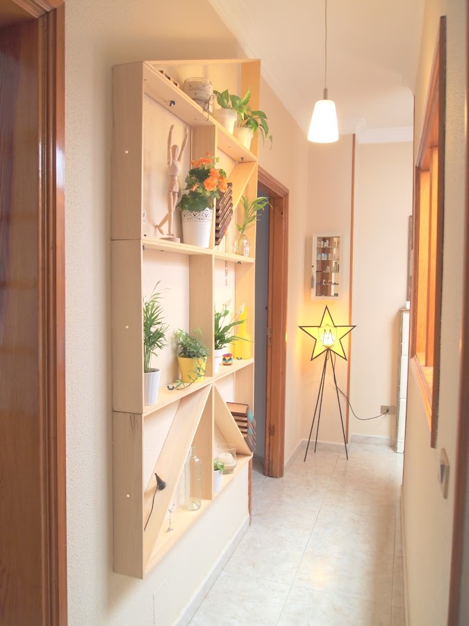 Luego vino el pensar para qué, dónde y cómo la pongo, y al final la mejor opción fue decorar un pasillo bastante estrecho en casa de mi madre, con un ventanal que da a un patio interior al que llega muchísima luz, ¡no veas el juego que le da a mi madre esta estantería!, ideal para plantas y cualquier objeto que a ella se le ocurra, no ocupa nada de espacio, es volátil! Sin duda, el rincón de la casa con más dinamismo! Ahhhh y la luz que está al fondo en forma de estrella es de otro escaparate también! :-))