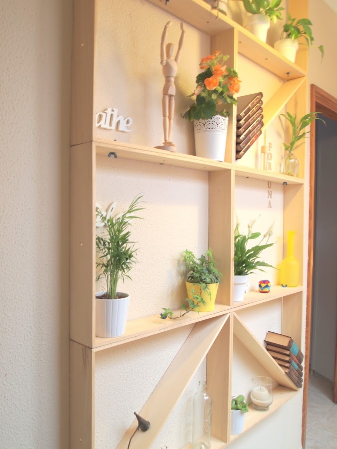 Todo empezó cuando visité la nueva casa de un amigo, un dúplex de estilo urbano que habían decorado con muy buen gusto y acierto, pero algo llamó mi atención, en la pared había una estantería que me sonaba! era una estantería que formaba parte de un escaparate de ropa y que estaban retirando por cambio de temporada! En seguida me puse en marcha para conseguir un ejemplar de alguna de las tiendas y así fue.......prácticamente regalada, me hice con un montón de tablas y tornillos de color azul....estaba encantada!!