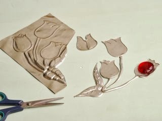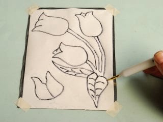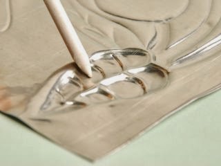 Copiar el diseño sobre papel de calco y cortar una pieza de estaño del tamaño adecuado.