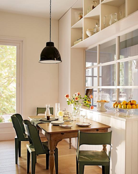 Cuando el comedor se coloca junto a ellas, conviene que sean correderas, ya que con las de apertura abatible los comensales podrían golpearse cuando las hojas estén abiertas. Si tienes un jardín o una terraza junto a la cocina, opta por una mesa de exterior que sea plegable, así podrás trasladar el office al aire libre en los meses de primavera y verano.