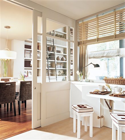 4- Si tienes la suerte de tener una especie de ventanal o mirador, aprovecha este espacio tan luminoso de galería para colocar un banco corrido bajo la misma y la mesa adecuada. Este rincón resultará de lo más acogedor y romántico. Ten en cuenta el sistema de apertura de las ventanas.