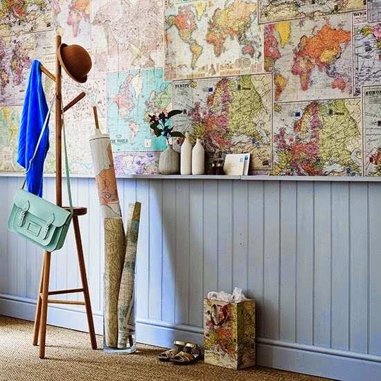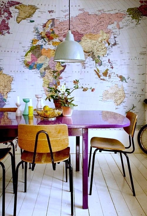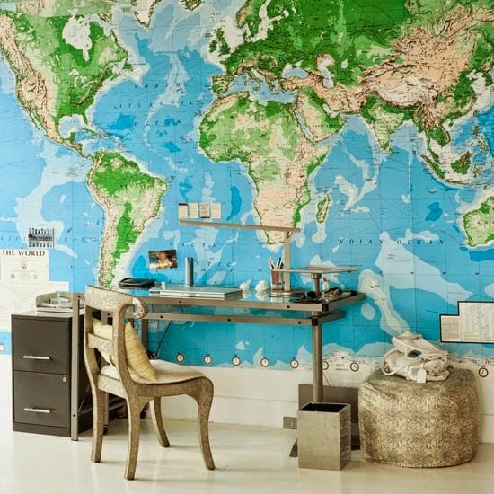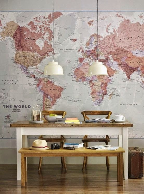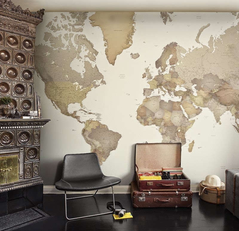 colgados de la pared con un montón de chinchetas marcando los países visitados y por visitar. Pero también es posible utilizar los mapas de un modo más decorativo, sin restarle encanto. Decorar con mapas es una de las últimas tendencias en decoración, ya sea ocupando toda la pared, en cuadros, en objetos decorativos, etc. Además, quedan bien en cualquier parte de la casa, en el salón, en el cuarto de los niños, en el dormitorio o en el despacho.