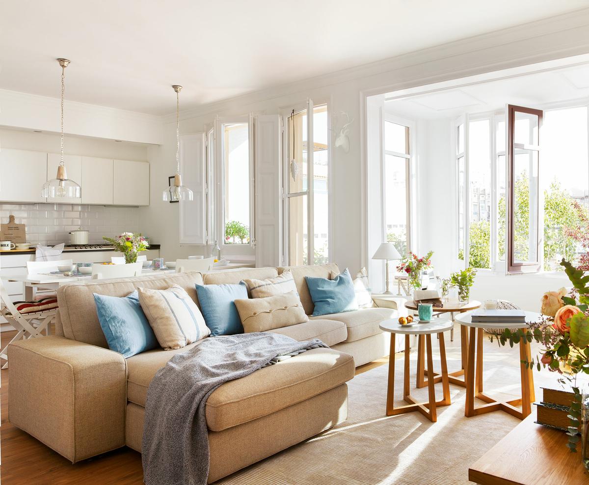3.- Huye de los textiles pesados del invierno. Cambia las cortinas o fundas de cojines por telas más ‘fresquitas’ y más ligeras. Recurre a motivos vegetales y tonos relacionados con la naturaleza. Recurre al visillo, mucho más ligero, de hilo o de lino, que permite el paso de la luz y no impide la vista, aportando mayor frescura al salón en la época estival.
