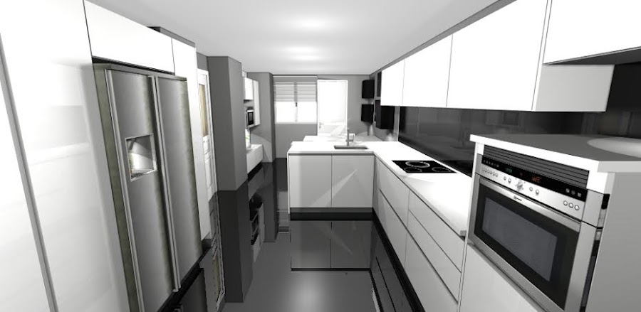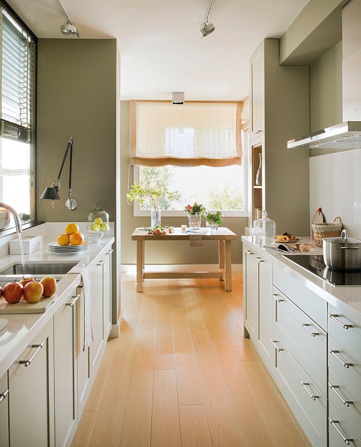 * TONALIDADES CLARAS. Para una cocina larga y estrecha, lo más recomendable es incluir una paleta de color en claro como el blanco, gris claro, beige u otro color que atraiga luz en el espacio para las paredes y armarios. Una cocina bien iluminada nos dará el efecto de amplitud de espacio como por arte de magia.