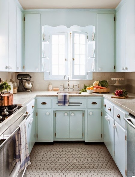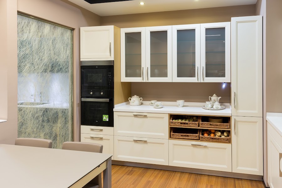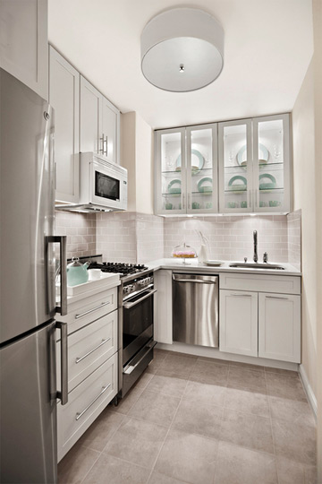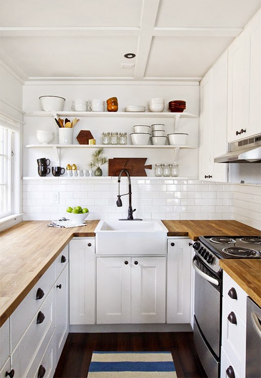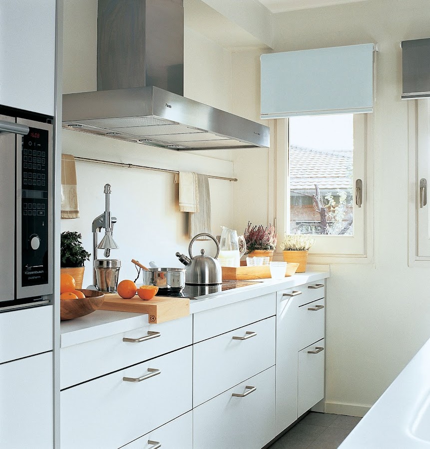 * MOBILIARIO Y DISTRIBUCIÓN. Instalar todos los usos en el orden que normalmente se sigue para la preparación de una comida: nevera, fregadero, horno y lavavajillas. Elige electrodomésticos de acero inoxidable o en blanco para reflejar la luz y hacer que la cocina parezca más grande. No adquieras muebles con puertas pues al abrirse ocupan demasiado espacio. En cocinas de escasas dimensiones lo aconsejable son muebles abiertos o con puertas correderas. Evita colocar cosas en el suelo, como por ejemplo cubos de basura, artículos de limpieza, etc. Los mismos quitarán el poco espacio de circulación que tenemos.