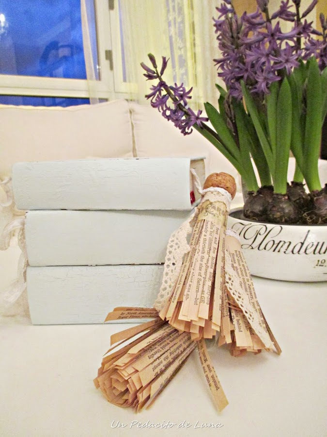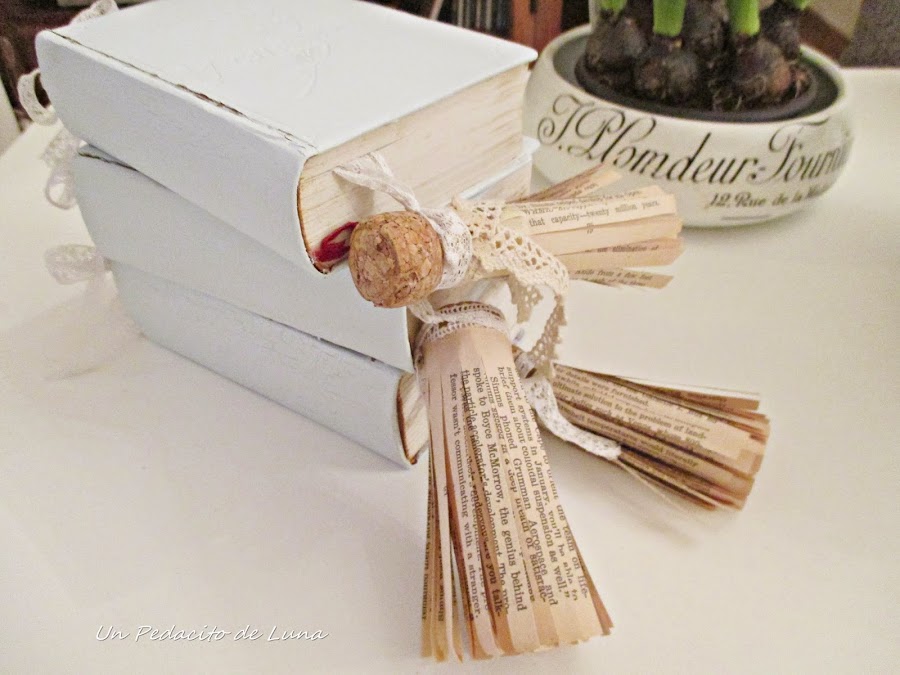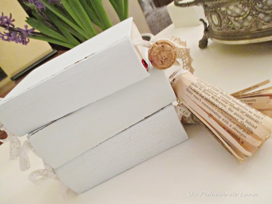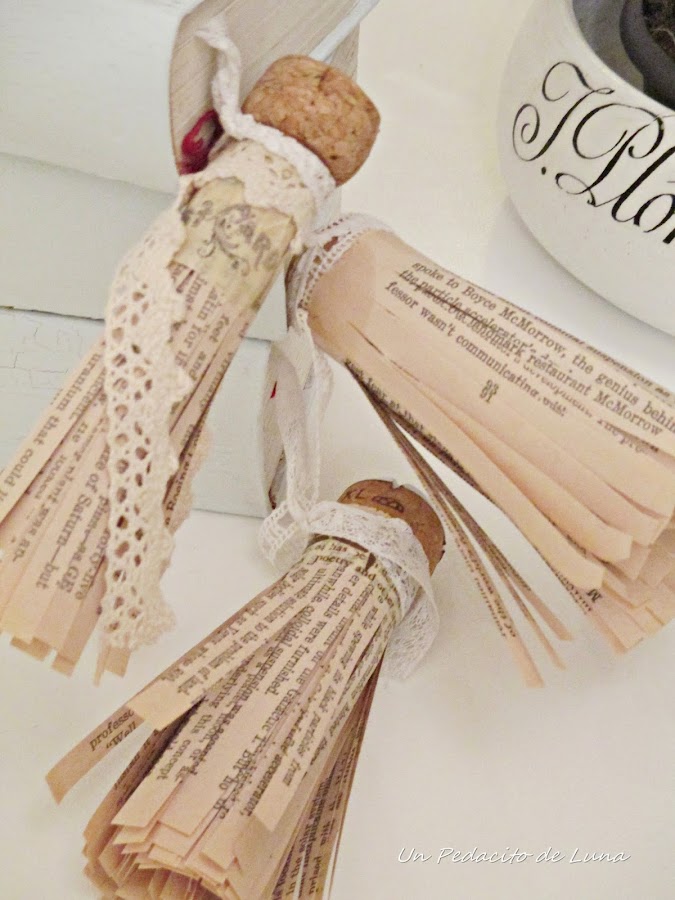 Para decorar hice unos marcadores muy vintage a base de hojas de libros, tapones de corcho, puntillas y encajes, lo cual iluminó un poquito más el trabajo.