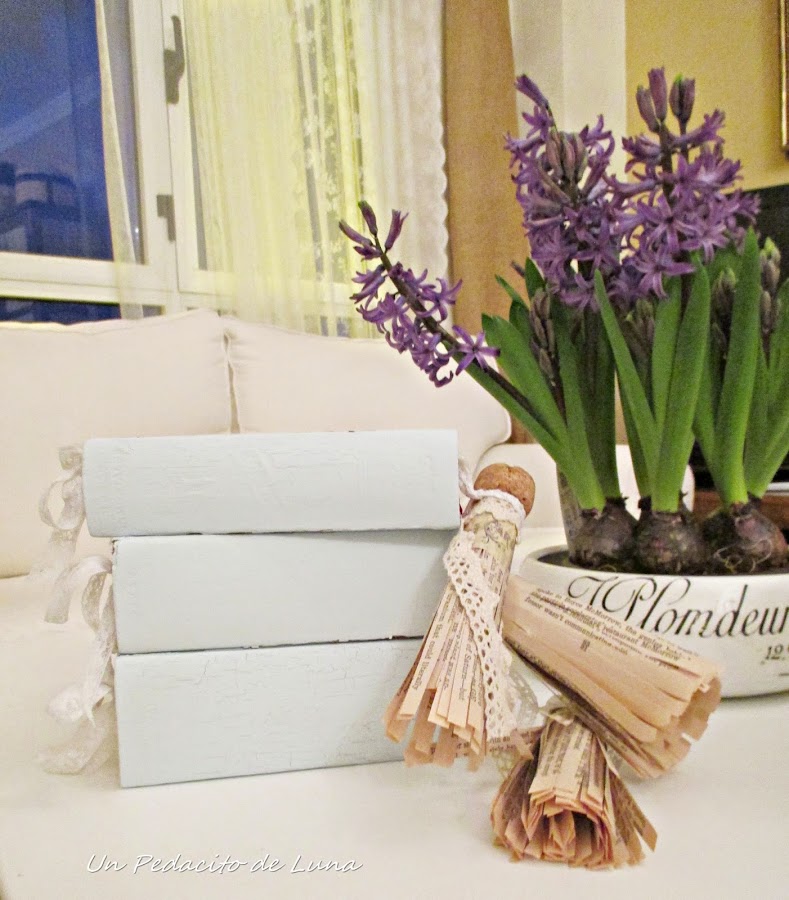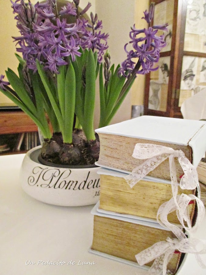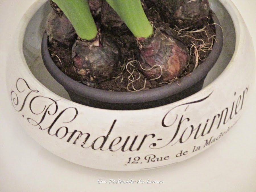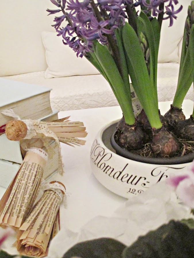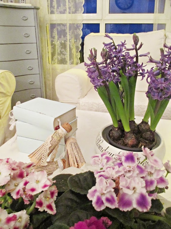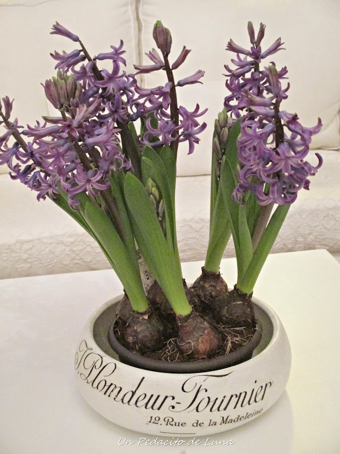 Los bulbos de jacintos ya empezaron a abrirse y expandir su delicioso aroma, así que me los traje al salón para acompañar la escena.