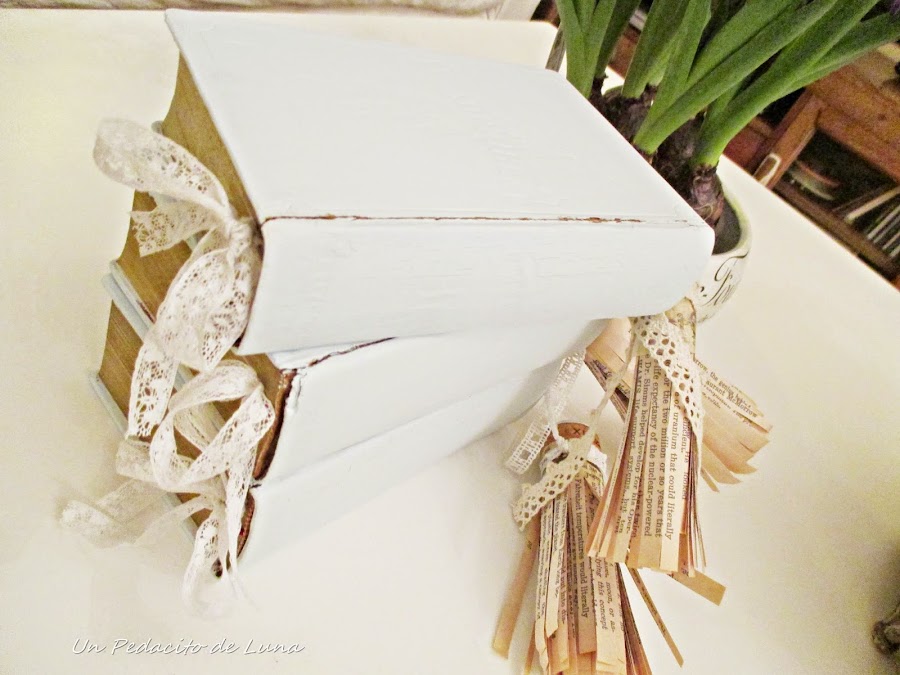 Las tapas se encontraban resecas y al contacto con la humedad de la pintura, formaron unas ranuras en los bordes, por otra parte, la pintura craqueló solita y aportó más carácter a estos libros, si cabe.