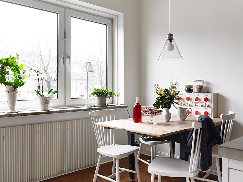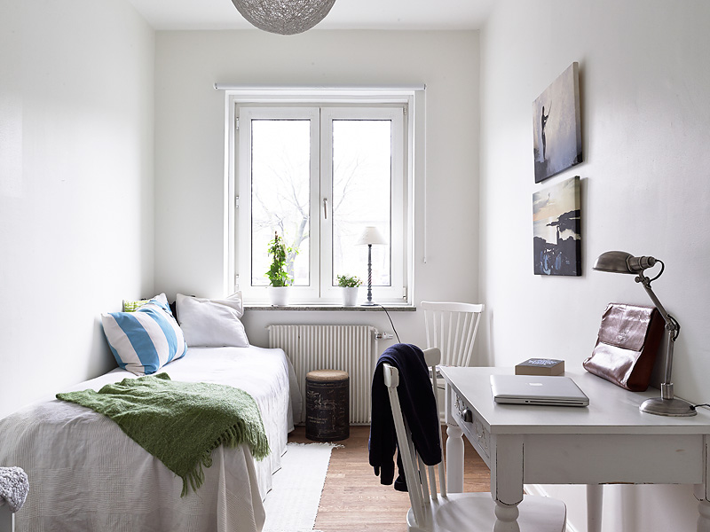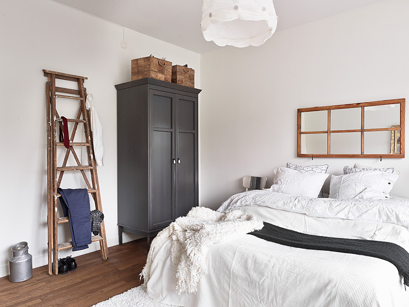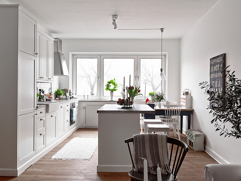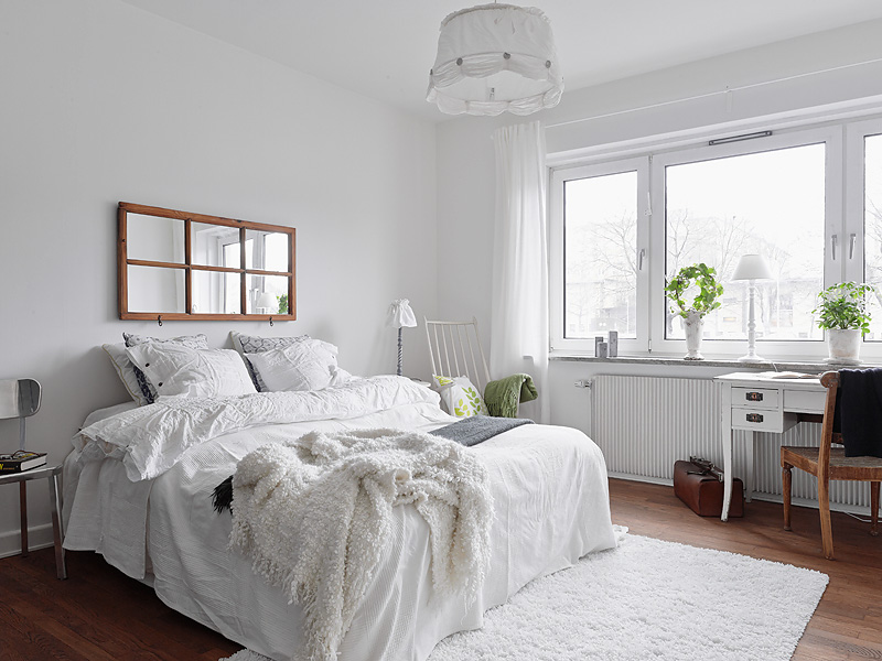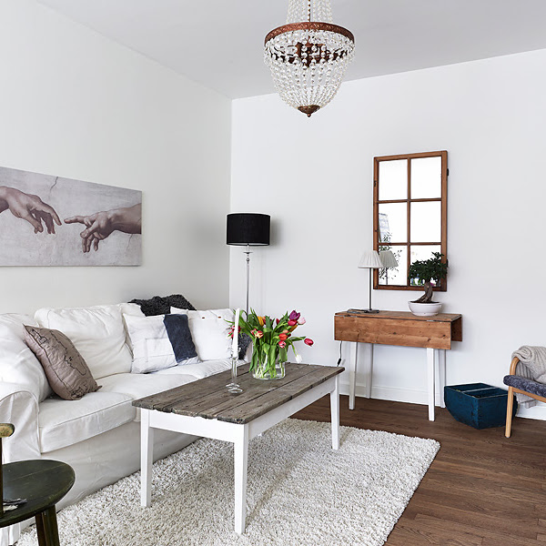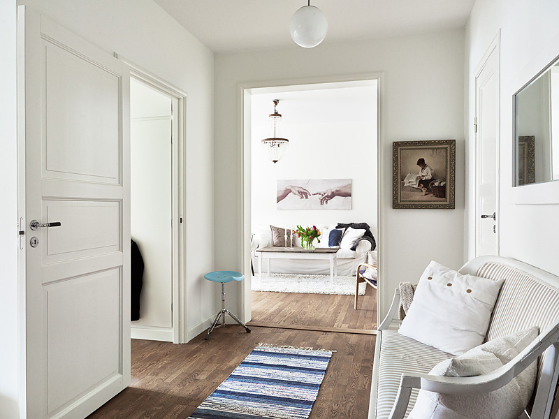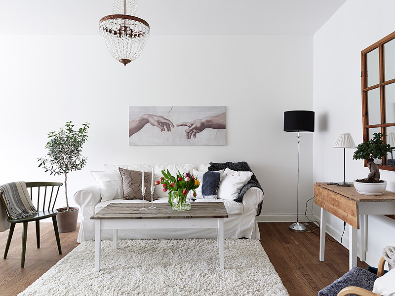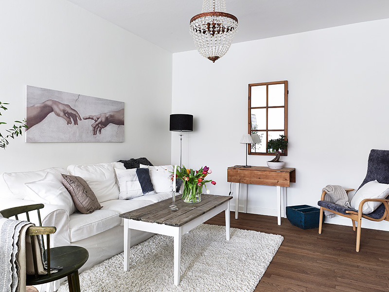 Compuesto principalmente de mobiliario blanco y la calidez del suelo de madera con ciertas piezas auxiliares que lo acompañan creando así, un contraste acogedor que no arriesga, un conjunto nórdico con cierto aire francés donde la sencillez y la pureza del blanco te embriaga en una atmósfera relajante.