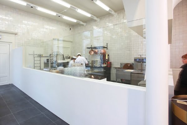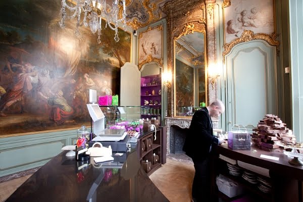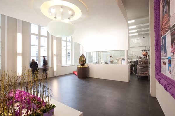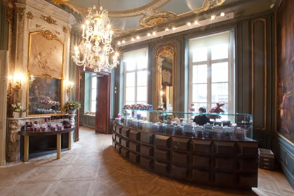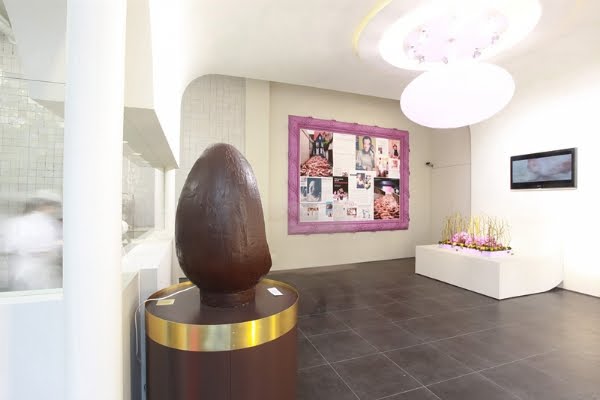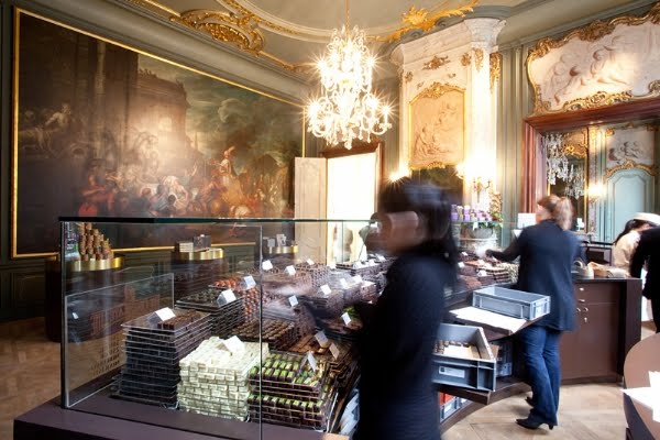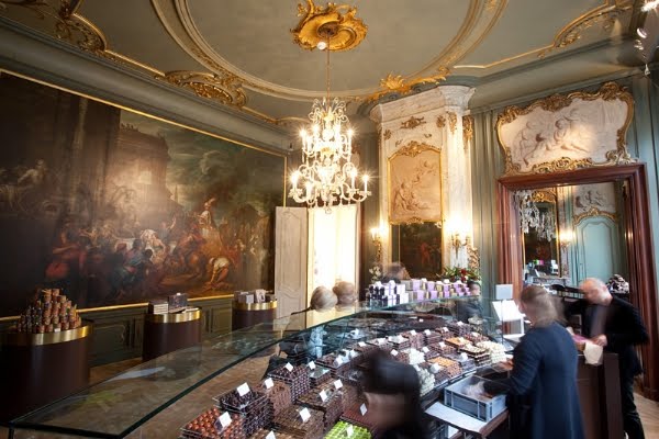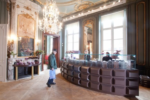 En el proyecto para la adaptación de la chocolatería se respetó integramente el diseño del salón original restaurando los lienzos existentes en las paredes y conservando el suelo original, el proyecto estuvo a cargo de Fabienne Design Studio quien diseñó unos originales mostradores en forma de chocolate. Os dejo con este delicioso sitio.