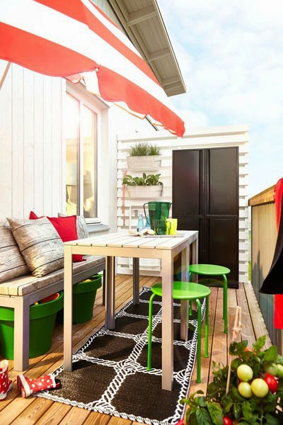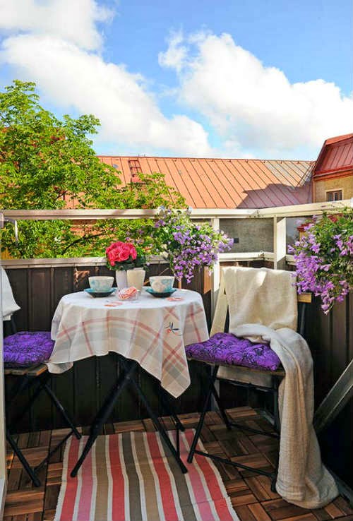 Cuanto más colorido sea tu balcón, más ánimo te infunde, así que no escatimes en plantar flores en vistosas macetas de colores, en sacar la vajilla y mantelería que usas habitualmente en verano , en poner cojines con alegres estampados en las sillas, en el suelo ...