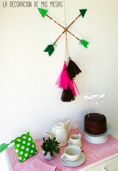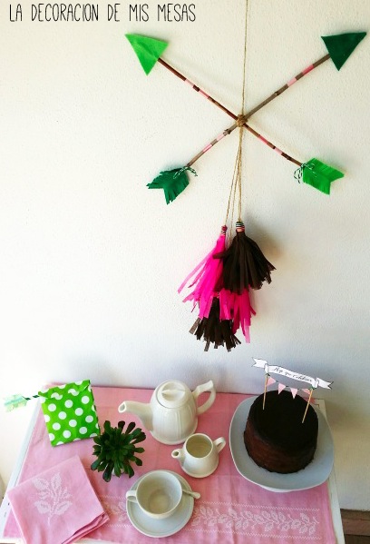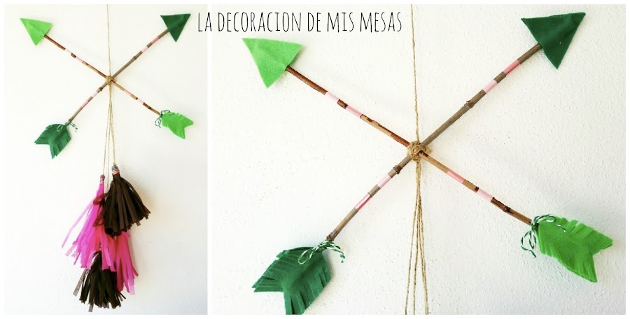 Las flechas se hacen con unas ramas, un poco de washi tape para adornar y fieltro para la punta y la pluma, nada complicado que haya que hacer un tutorial (pero sí lo queréis, decídmelo y lo subo próximamente). Unas borlas de papel y ¡andando que es gerundio!.