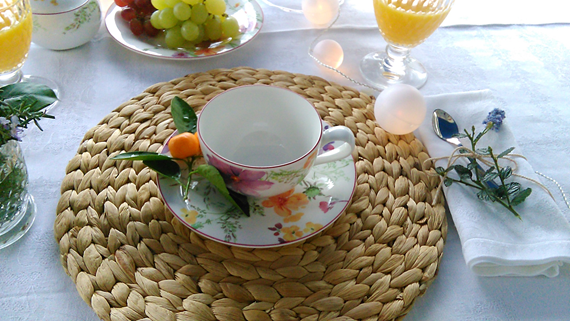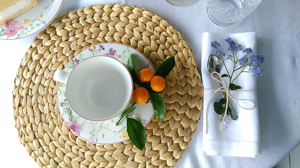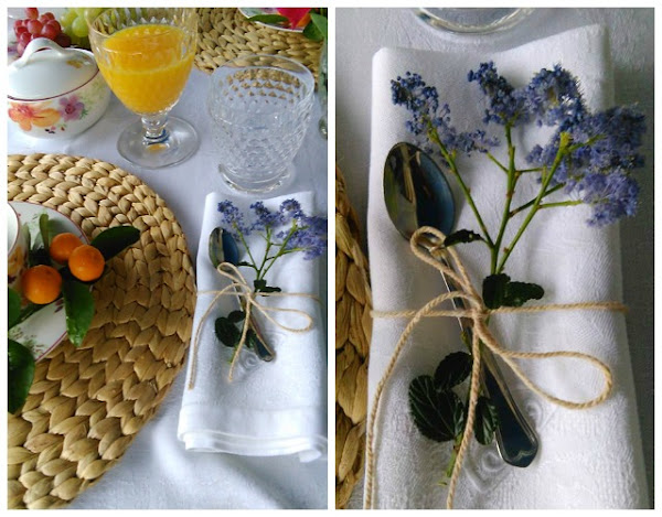Y sinceramente poco mas, unas hojas con naranjas enanas decorando los platos de desayuno, un vaso a modo de jarrón con flores cortadas de mi terraza combinadas con florecillas silvestre y unos salvamanteles de rattán.