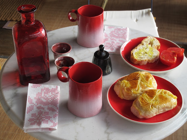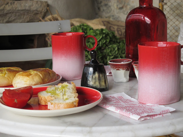 En esta ocasión he preparado un desayuno un poco especial para un día especial, con tazas y vasitos en degradé , con el rojo como color dominante , os gusta? no esta mal para empezar el día verdad?