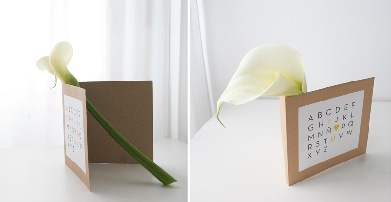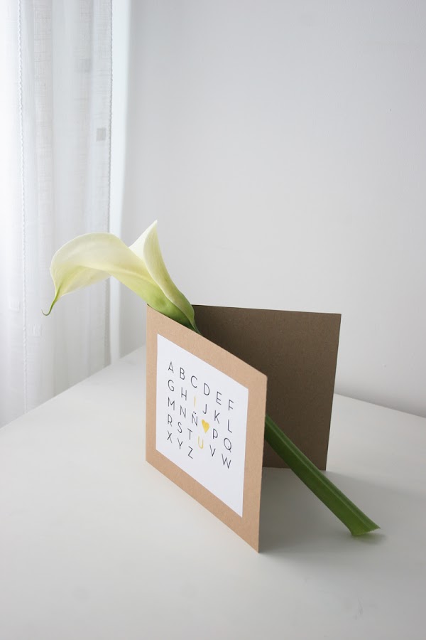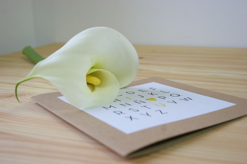 Nosotros finalmente hemos hecho una tarjeta muy sencilla. La hemos impreso sin color y coloreado de amarillo, porque es el color que mejor le va a la flor que la acompaña: La cala. Y para asegurarnos que todo queda bien pegado, hemos impreso la plantilla en una pegatina A4.