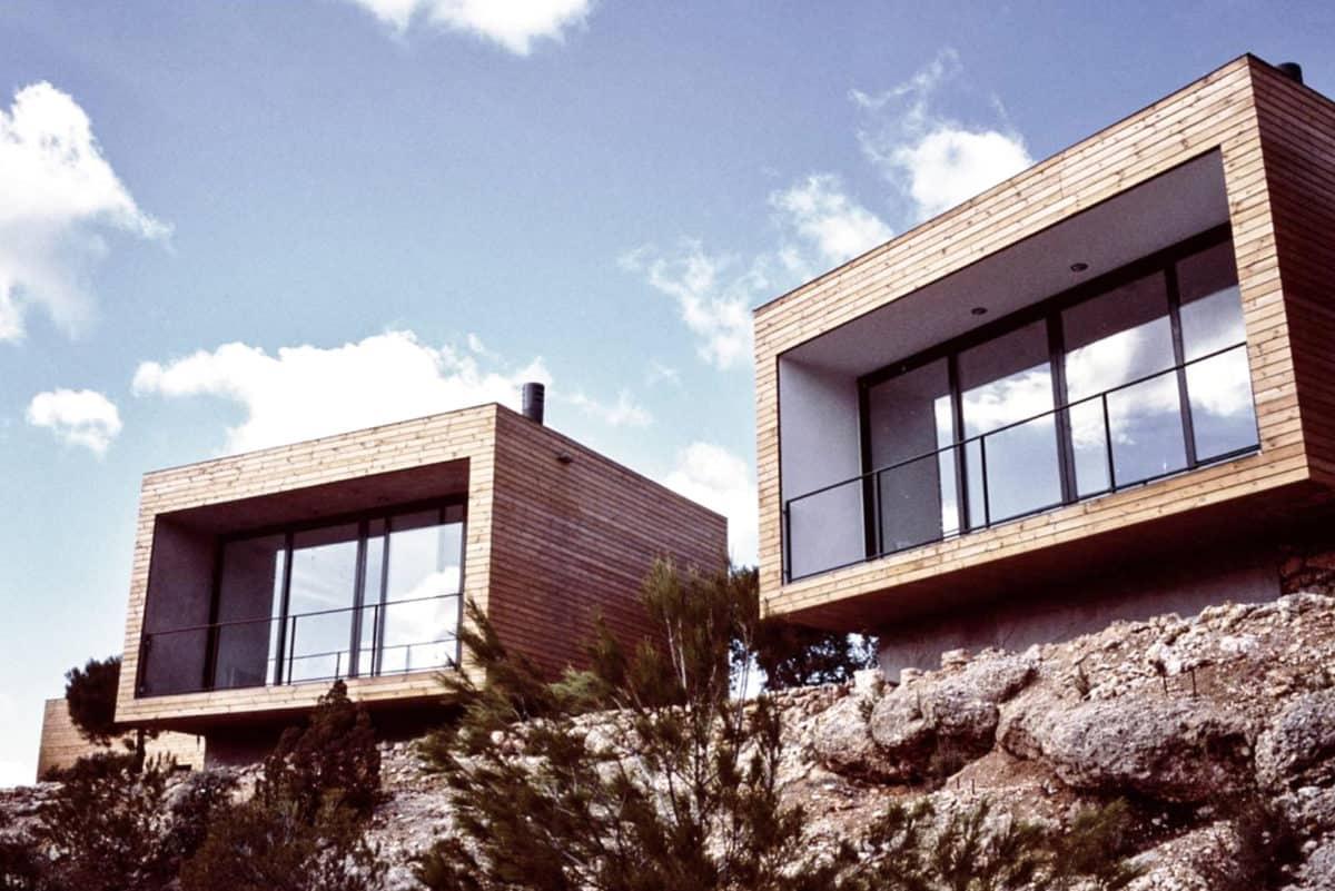 Fuente: elle Singular alojamiento situado en Matarrala, en Teruel. Compuesto de cabañas de madera con un diseño contemporáneo de líneas rectas y grandes ventanales que ofrecen intimidad y conexión con el entorno. Cuentan en su interior bañera excavada en el suelo de pizarra, chimenea colgante, cama tipo tatami, etc., todo tipo de lujo para una escapada romántica.