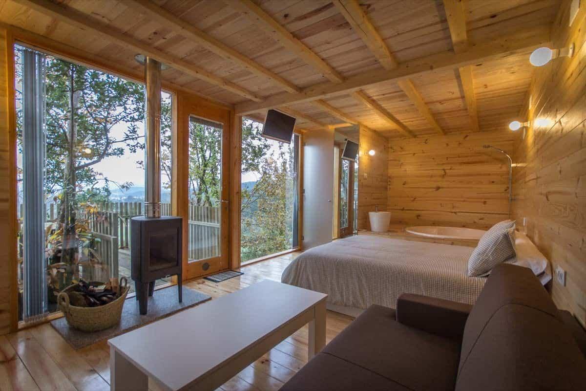 Fuente: pinterest Tres exclusivas cabañas de madera de diseño moderno rodeadas de naturaleza. Se encuentra en la comarca de Compostela entre bosques y prados, muy cerca del puente colgante del Xirimbao sobre el rio Ulloa. Un nuevo concepto de turismo rural sostenible y respetuoso con el medio ambiente. Las cabañas cuentan con la calidez de la madera de pino ecológico y una decoración inspirada en el estilo nórdico. Cada cabaña cuenta con una capacidad para dos adultos y un niño. Tiene una superficie de 27 metros cuadrados y una terraza de 9 m.