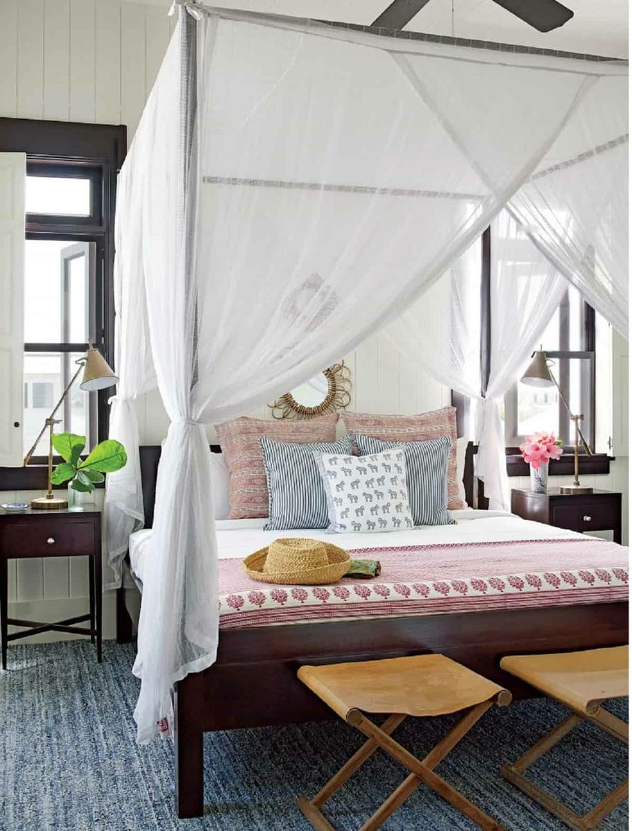 Fuente: pinterest Los textiles son fundamentales en el estilo colonial. Cobran gran importancia las cortinas con tejidos naturales y en tonos claros. Los tejidos más utilizados son el algodón y el lino. Estampados como motivos de la fauna y flora de las colonias. Cubren los doseles de las camas de dosel con telas ligeras a modo de mosquiteras Las alfombras con fibras vegetales son perfectas para dar un toque cálido y natural. Se apuesta por un estilo artesanal con telas bordadas.